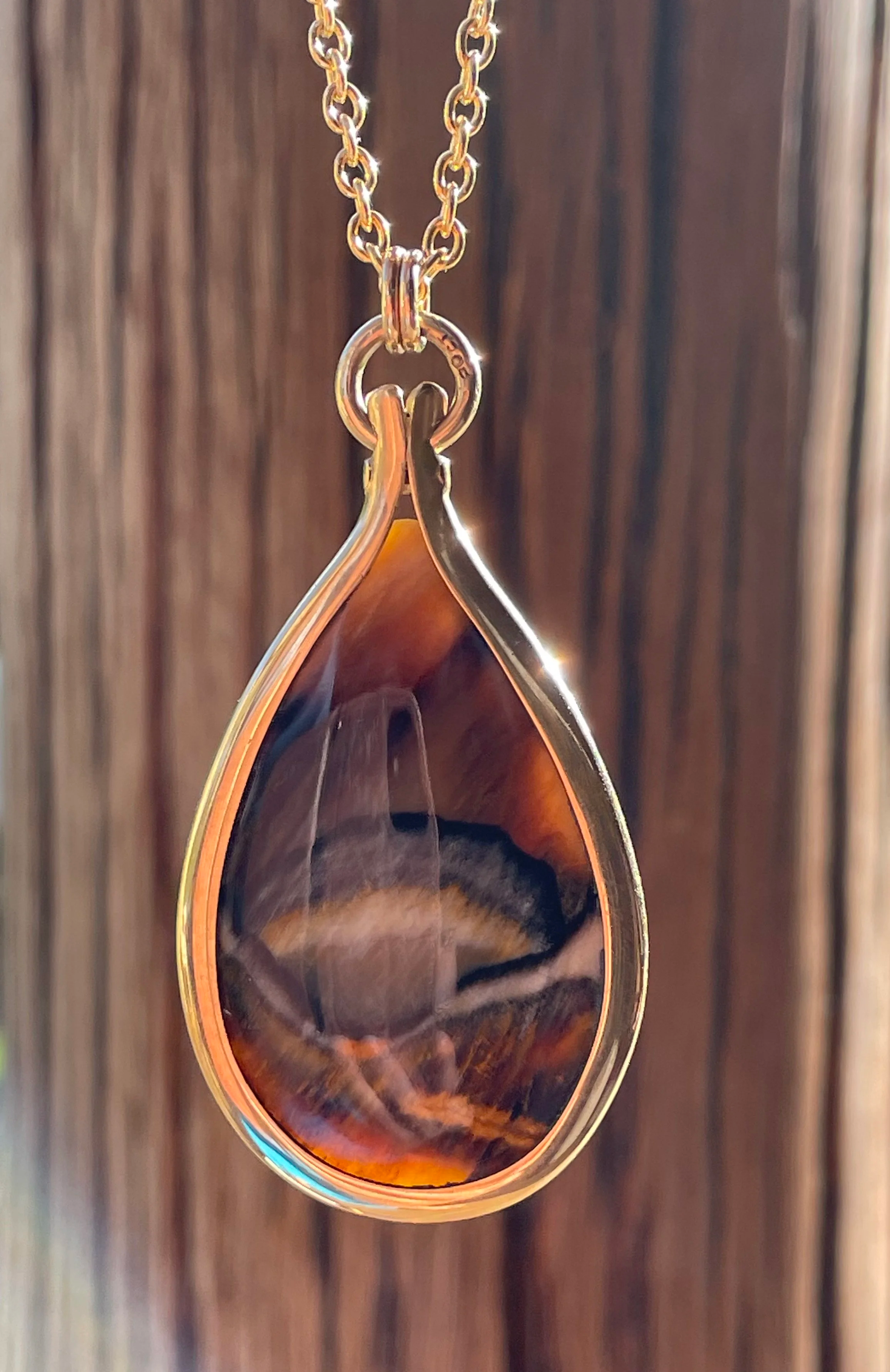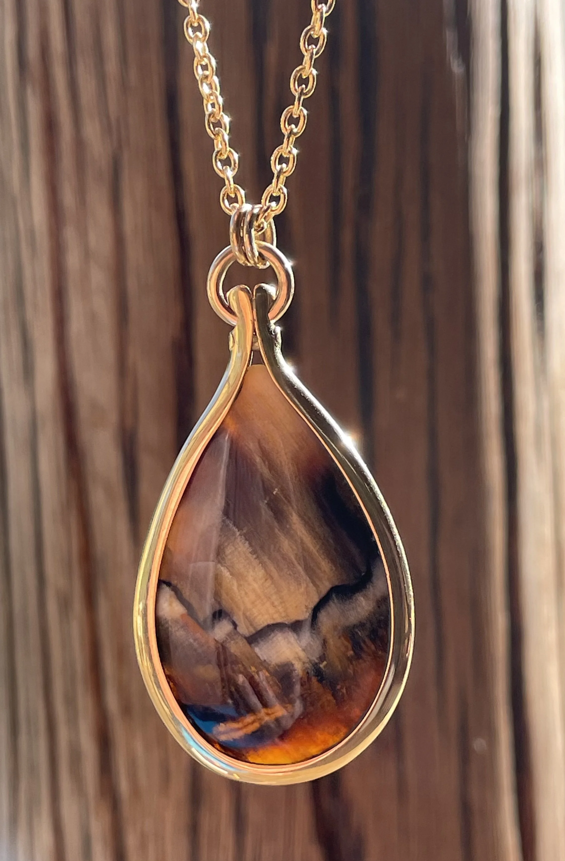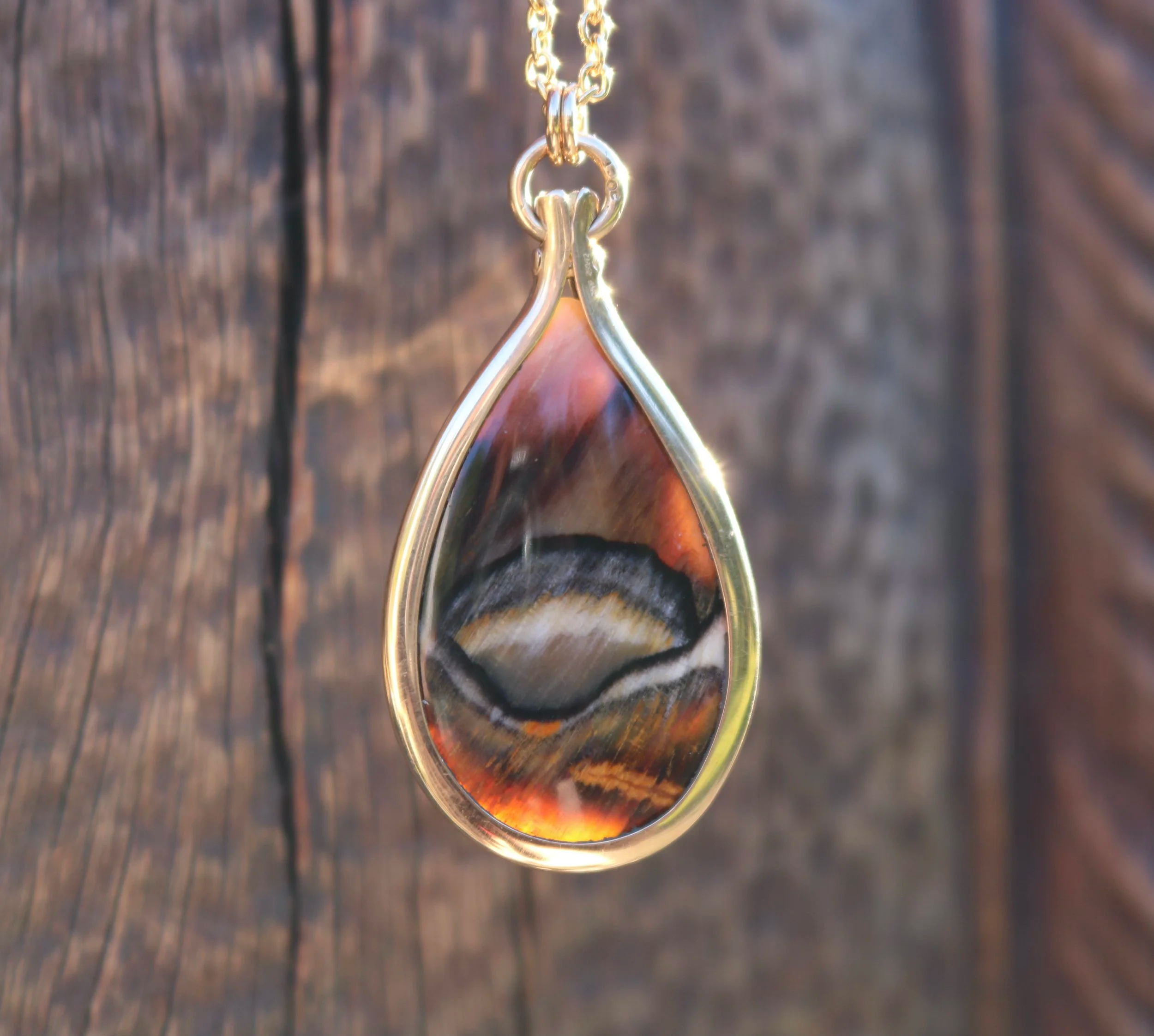 Categories: All Sculptures Carvings Drop pendants Ear wear Other stone Paua & Mother of Pearl Opalised Wood All / Opalised Wood 20 carat Gold Pendant with Opalised Wood NZ$6,500.00